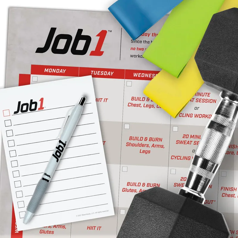 For a quick overview of the program and your workout schedule, check out the Job 1 Get Started Guide and Calendar. The program also includes a Job 1 Notepad, where you can check off your workouts as a daily commitment to yourself. You’ll need light, medium, and heavy dumbbells, as well as resistance loops. A stationary bike is optional, but you’ll need one if you want to do Jennifer’s bonus cycling workouts. Looking to add a stationary bike to your workout setup? Visit Beachbody.MYXFitness.com to learn more about the MYX Home Studio.*