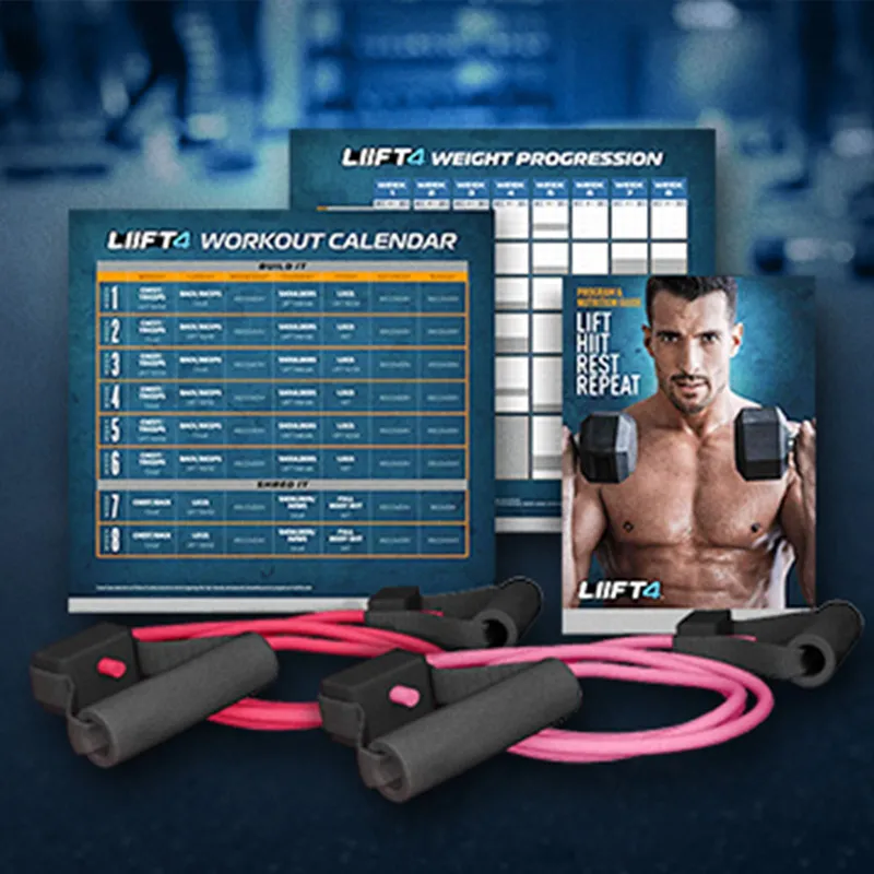 You’ll get the LIIFT4 Program & Nutrition Guide, a Calendar, and a Weight Progression Tracker. Essential equipment includes 2 levels of Resistance Bands as an alternative to weights.
